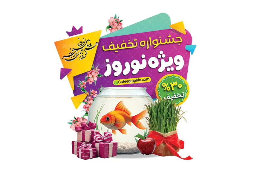طرح لایه باز استیکر تخفیفات نوروزی یا طرح بنر جشنواره فروش ویژه نوروزی را بصورت لایه باز در فرمت PSD فتوشاپی،ابعاد20*30 افقی و با استاندارد رنگ بندی چاپی دیجیتال قرار دادیم .برای دانلود رایگان طرح بنر تخفیف عید نوروز ،با خرید اشتراک از سایت کافه گرافیک اقدام نماید .