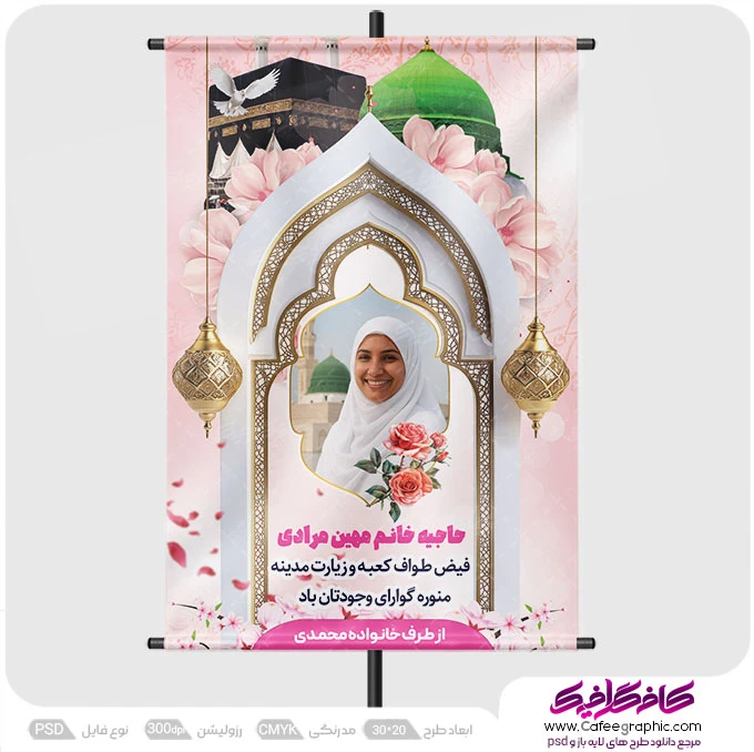 طراحی این بنر مکه ای حاجیه خانم لایه باز توسط تیم کافه گرافیک بصورت اختصاصی انجام شده و در هیچ وب سایت دیگری نمونه مشابه ندارد.