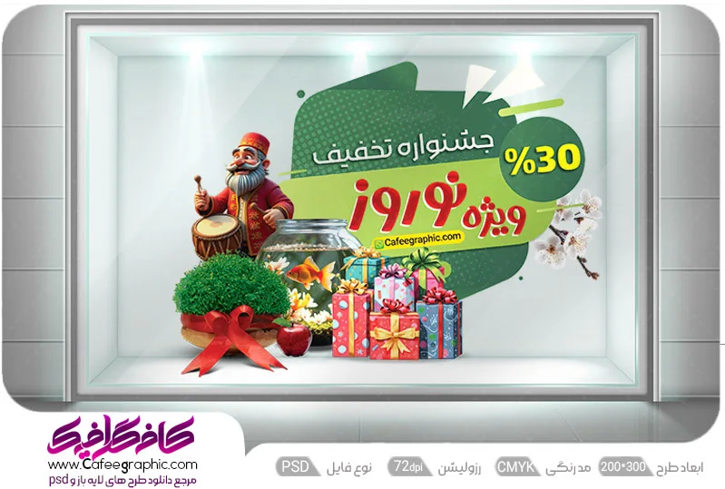 طرح استیکر تخفیف نوروزی لایه باز یا طرح بنر جشنواره فروش نوروزی را بصورت لایه باز در فرمت PSD فتوشاپی،ابعاد20*30 افقی و با استاندارد رنگ بندی چاپی دیجیتال قرار دادیم .برای دانلود رایگان طرح بنر تخفیف عید نوروز ،با خرید اشتراک از سایت کافه گرافیک اقدام نماید .