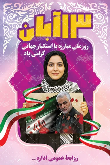 طراحی بنر راهپیمایی 13 آبان روز دانش آموز با بک گراند و تصویر دانش آموز دختر بسیجی با قاب عکس تصویر حاج قاسم ، تایپوگرافی 13 آبان طراحی شده است.