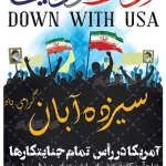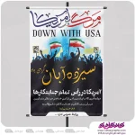 بنر راهپیمایی روز دانش آموز با بک گراند و تصویر راهپیمایی 13 آبان، تایپوگرافی مرگ بر امریکا ، تصویر پرچم ایران طراحی شده است.