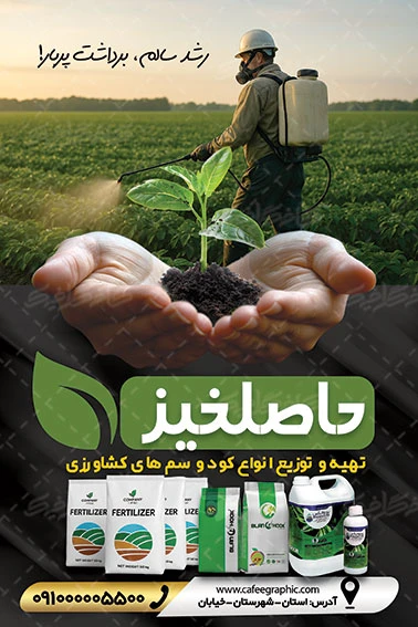 طرح تراکت تبلیغاتی خدمات کشاورزی لایه باز رایگان یا نمونه پوستر تبلیغاتی برای فروشگاه سموم کشاورزی در فرمت PSD  تک رو  و مد رنگی CMYK با رنگ بندی سبز جذاب و تصویر انواع سموم و کود های کشاورزی و تصویر تراکتور کشاورزی آماده و طراحی شده است .برای  دانلود طرح تبلیغات خدمات کشاورزی با خرید اشتراک و پلن های متنوع از سایت کافه گرافیک اقدام نماید .