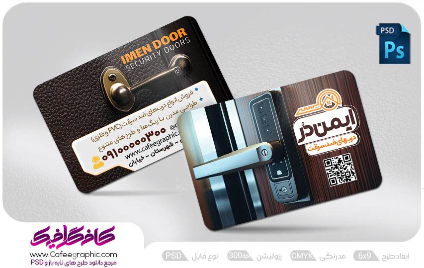 نمونه کارت ویزیت فروش و نمایندگی دربهای ضدسرقت با فتوشاپ cs6 طراحی شده است و هیچ مشکلی با ورژن های دیگر فتوشاپ ندارد.