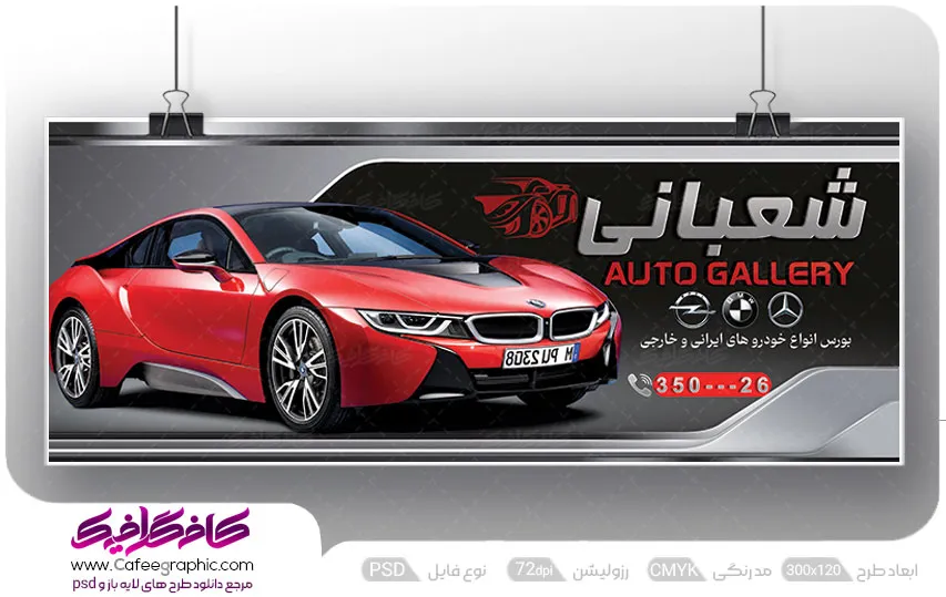 طرح تابلو تبلیغاتی اتوگالری اتومبیل لایه باز یا تابلو بنر سردر نمایشگاه خودرو را بصورت لایه باز در فرمت PSD فتوشاپی،ابعاد 120*300 و با استاندارد رنگ بندی چاپی دیجیتال قرار دادیم .برای دانلود رایگان طرح بنر نمایشگاه اتومبیل ،با خرید اشتراک از سایت کافه گرافیک اقدام نماید .