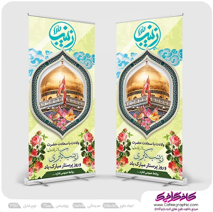 استند تبریک ولادت حضرت زینب و روز پرستار لایه باز یا طرح بنر تبریک به مناسبت روز پرستار را با طراحی منحصر به فرد برای شما طراحان و مشتریان عزیز قرار دادیم، طرح استندی ولادت حضرت زینب(س) در فرمت PSD فتوشاپی،ابعاد 200*90 عمودی به صورت لایه باز فتوشاپی آماده شده است .