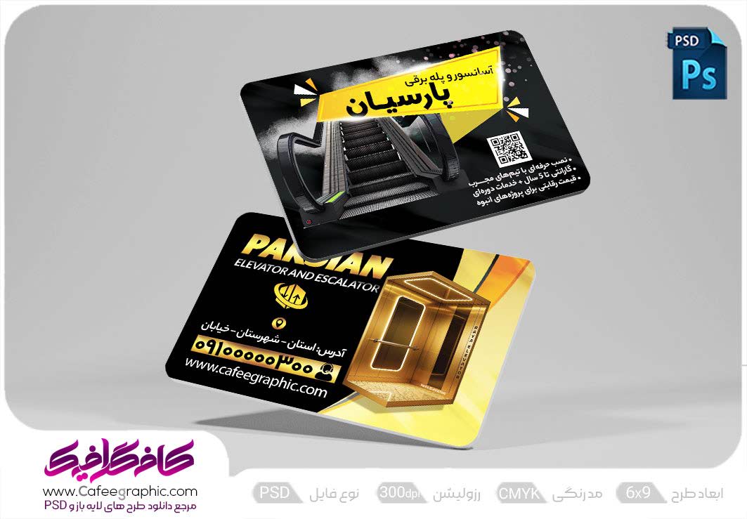 کارت ویزیت لایه باز آسانسور و پله برقی رایگان یا طرح کارت ویزیت نصب و تعمیرات بالابر در فرمت psd فتوشاپی، ابعاد 6*9 به صورت دو رو لمینت طراحی و برای شما علاقه مندان در سایت منتشر دادیم .