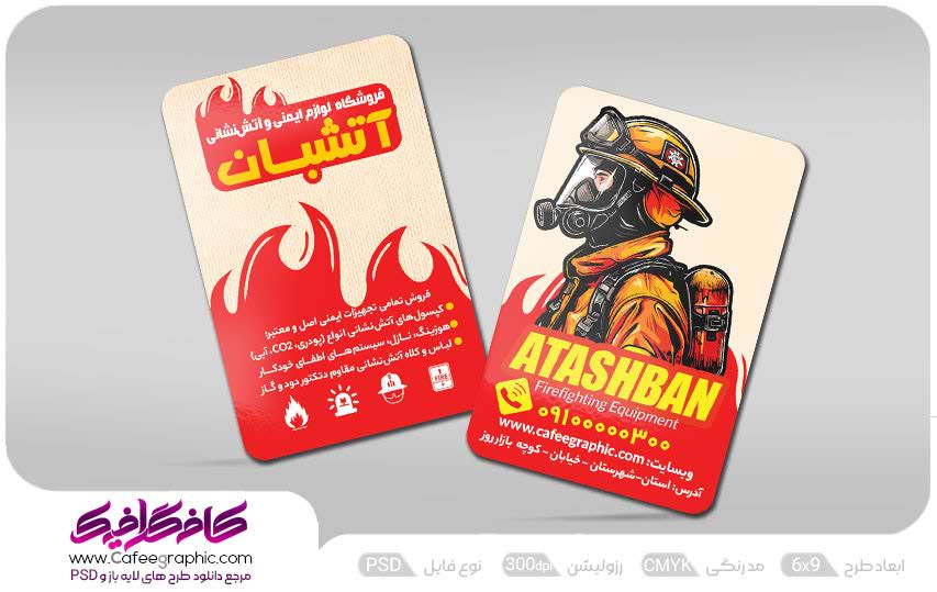 طراحی کارت ویزیت فروشگاه تجهیزات و لوازم ایمنی و آتشنشانی با فتوشاپ cs6 طراحی شده است. و هیچ مشکلی با ورژن های دیگر فتوشاپ ندارد.