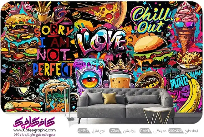 طرح پوستر دیواری کافه رستوران باکیفیت را بصورت تصویر در فرمت jpeg  ،ابعاد 300*200 و با استاندارد رنگ بندی چاپی دیجیتال به صورت نقاشی گرافیتی قرار دادیم .برای دانلود نمونه طرح گرافیتی کافه فست فودی ،با خرید اشتراک از سایت کافه گرافیک اقدام نماید .