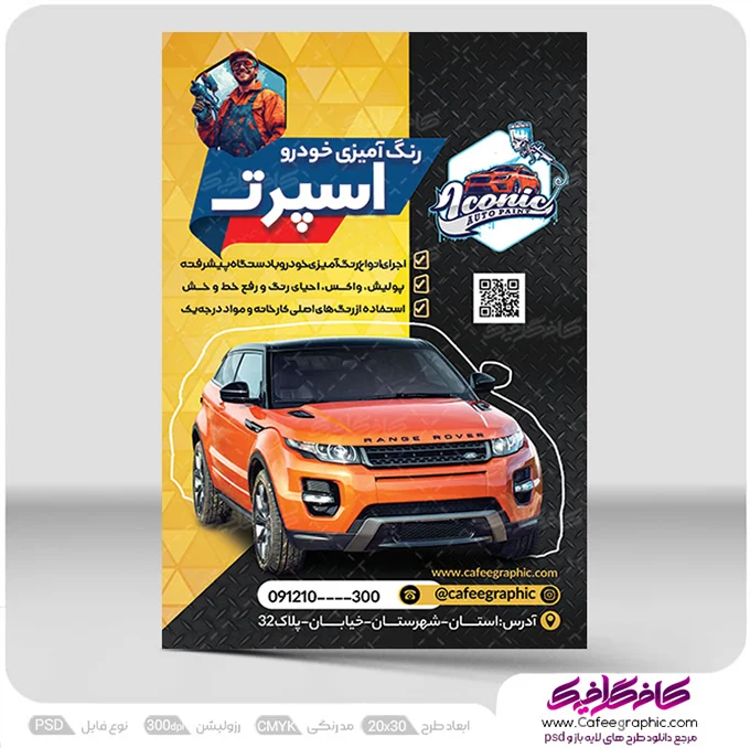 طرح تراکت نقاشی اتومبیل لایه باز رایگان یا عکس باکیفیت نقاشی و صافکاری خودرو با فرمت لایه باز فتوشاپی تک رو و مد رنگی CMYK با رنگ بندی مشکی و زرد و تصویر خودروی خارجی آماده و طراحی شده است .برای دانلود رایگان تراکت رنگ آمیزی خودرو با خرید اشتراک و پلن های متنوع از سایت کافه گرافیک اقدام نماید .