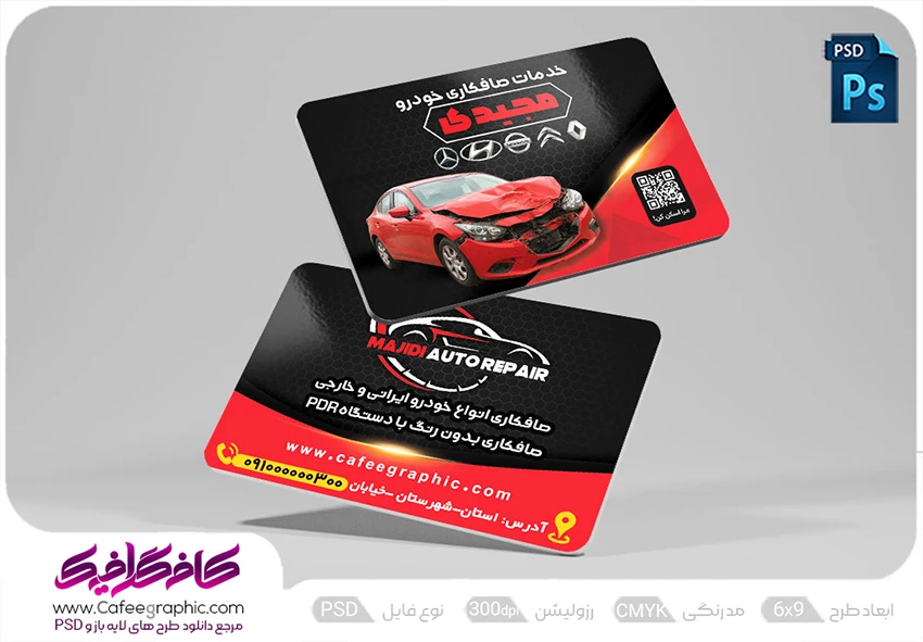 طراحان عزیز می توانند بدون هیچ افت کیفیتی در ابعاد مختلف کارت ویزیت لایه باز صافکاری خودرو را تغییر و طراحی مجدد کنند. چون به صورت لایه باز و با استفاده از ابزار shape و smart object طراحی گردیده است.