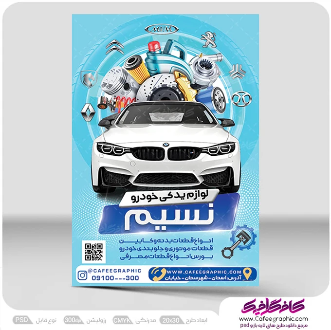 طراحی پوستر فروشگاه لوازم یدکی اتومبیل های ایرانی و خارجی در اندازه20*30 بصورت تک رو برای انواع چاپ افست و دیجیتال ، مطابق با استاندارد های چاپخانه می باشد.