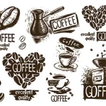 طراحی برچسب و استیکر کافه با بک گراند سفید و وکتور انواع لوازم و آسیاب قدیمی قهوه، دانه های قهوه در طراحی شیک برای تغیرات و شخصی سازی می بایست فایل را دانلود نمایید و با فتوشاپ تغیرات لازم را اعمال نمایید.