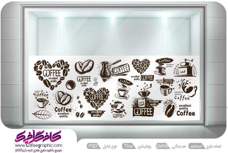 طرح برچسب شیشه کافه قهوه لایه باز یا استیکر تبلیغاتی فروشگاه قهوه وکافی شاپ را بصورت لایه باز در فرمت PSD فتوشاپی،ابعاد استاندارد و با استاندارد رنگ بندی چاپی دیجیتال قرار دادیم .برای دانلود نمونه لیبل کافی شاپ و قهوه فروشی ،با خرید اشتراک از سایت کافه گرافیک اقدام نماید .