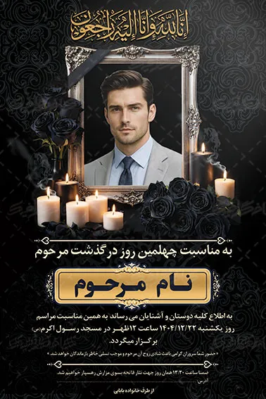دانلود رایگان فایل خام اعلامیه ترحیم چهلم در اندازه 20*30 بصورت تک رو برای انواع چاپ افست و دیجیتال ، مطابق با استاندارد های چاپخانه می باشد.