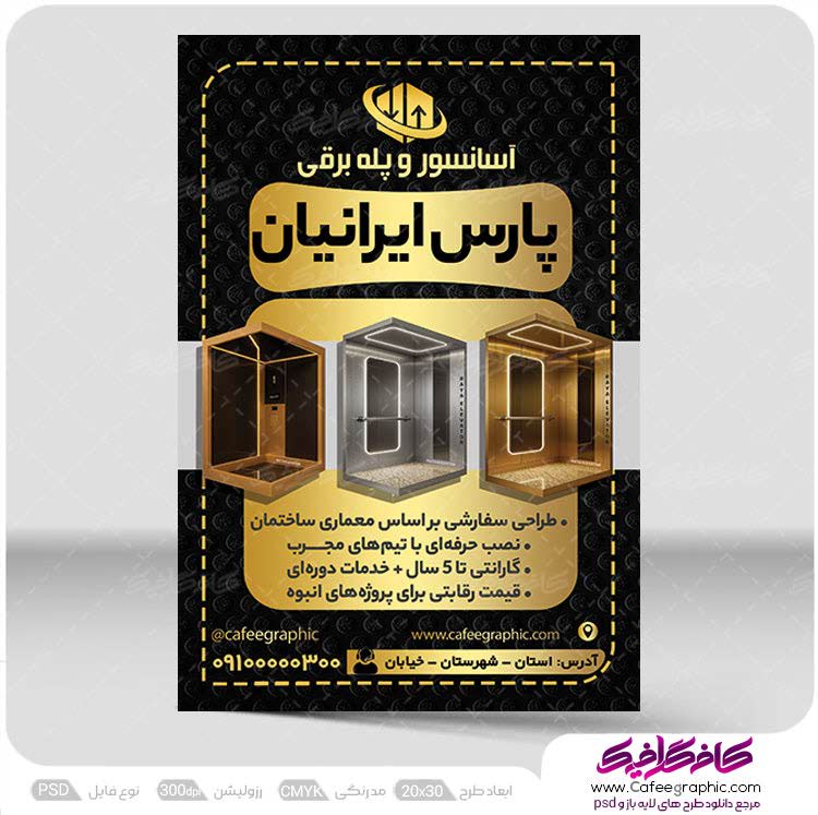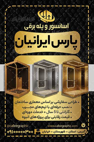 نمونه تراکت آسانسور و پله برقی لایه باز رایگان یا طراحی پوستر تبلیغاتی برای نمایندگی نصب آسانسور و خدمات پس از فروشی در فرمت psd فتوشاپی،ابعاد21*30 عمودی با بک گراندمشکی و طلایی به همراه تصویر انواع آسانسور که جلب توجه می کند، طراحی شده است .