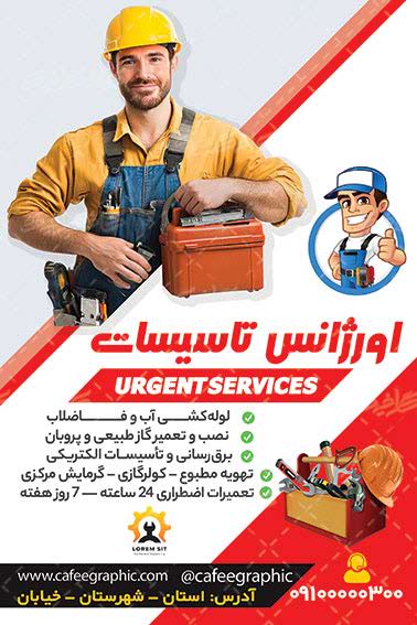 طرح تراکت خدمات فنی تاسیسات لایه باز ،بسیار جذاب و شیک در فرمت psd فتوشاپی،ابعاد21*30 عمودی با بک گراند قرمز وسفید و تصویر تکنسین و تعمیرکار، لوله کش فنی ساختمان که جلب توجه می کند،طراحی شده است .