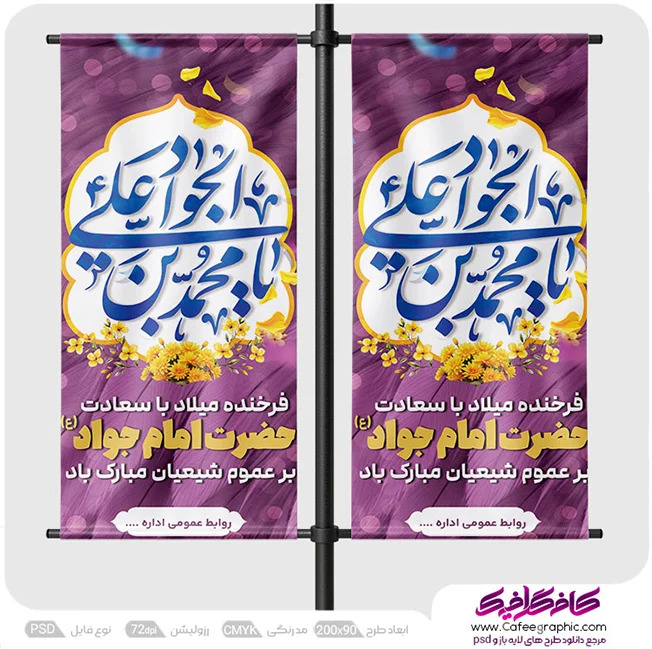 طرح استند ولادت امام جواد (ع) لایه باز رایگان یا نمونه طرح پوستر ولادت امام جواد را با طراحی منحصر به فرد و حرفه ای برای شما طراحان و مشتریان عزیز قرار دادیم نمونه طرح ایستاده ولادت جواد الائمه در فرمت psd فتوشاپی،ابعاد 200*90 عمودی به صورت لایه باز قرار دادیم .