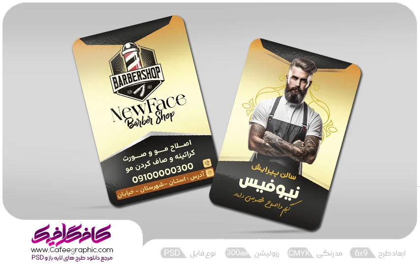 طرح کارت ویریت آرایشگاه مردانه لایه باز رایگان یا نمونه کارت ویزیت آرایشگاه مردانه رایگان در فرمت psd فتوشاپی،ابعاد 6*9 به صورت دو رو لمینت عمودی با رنگبندی طلایی و مشکی می باشد .