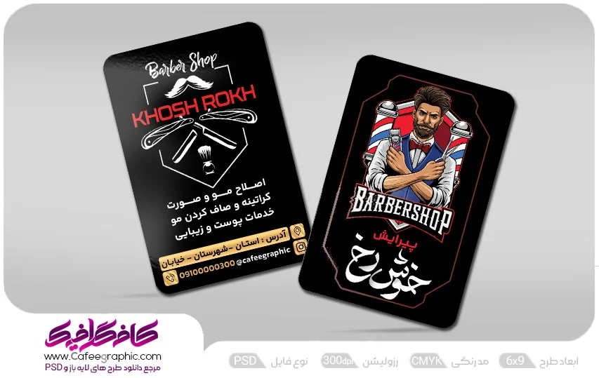 کارت ویریت آرایشگاه مردانه psd رایگان یا نمونه کارت ویزیت آرایشگاه مردانه لایه باز در فرمت psd فتوشاپی،ابعاد 6*9 به صورت دو رو لمینت عمودی با رنگبندی مشکی می باشد .