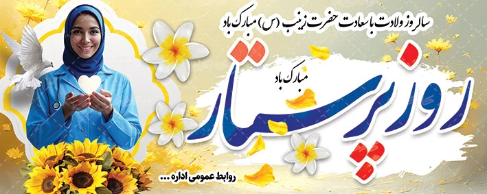 نمونه بنر ولادت حضرت زینب و روز پرستار لایه باز یا طرح پلاکارد تبریک روز پرستار را با طراحی منحصر به فرد برای شما طراحان و مشتریان عزیز قرار دادیم، طرح آماده تبریک روز پرستار و ولادت حضرت زینب(س) در فرمت PSD فتوشاپی،ابعاد 100*250 افقی به صورت psd فتوشاپی آماده شده است .