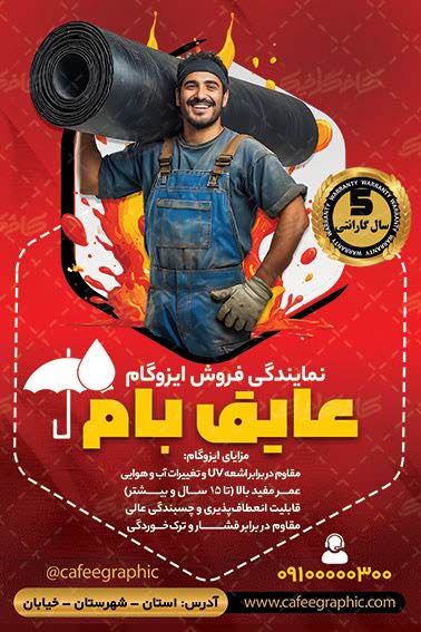 نمونه تراکت ایزوگام لایه باز رایگان یا نمونه پوستر تبلیغاتی برای نصب ایزوگام و عایق رطوبتی در فرمت psd فتوشاپی،ابعاد21*30 عمودی با بک گراند قرمز تیره به همراه تصویر عایق رطوبتی و قیرگونی که جلب توجه می کند، طراحی شده است .