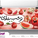 با بک گراند قرمز و به همراه عکس با کیفیت شخصیت کارتونی انار که نماد و سمبل شب چله می باشد طراحی شده است .