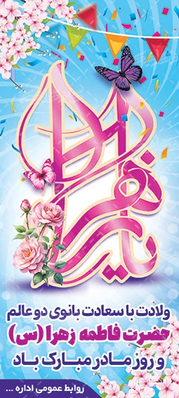 طرح عمودی ولادت حضرت فاطمه و روز مادر در زمینه آبی و حاشیه شکوفه و گل و در وسط طرح و تایپوگرافی یا زهرا در طراحی شیک برای تغیرات و شخصی سازی کافی است فایل را دانلود نمایید و با فتوشاپ تغیرات لازم را اعمال نمایید.