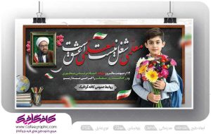 در فرمت لایه باز فتوشاپی،ابعاد 100*280 استاندارد رو رزولیشن 72 با بک گراند روشن و تمثال دانش آموز پسر و تایپوگرافی از معلم جان روشن یافتیم که جلب توجه می کند، قرار دادیم .