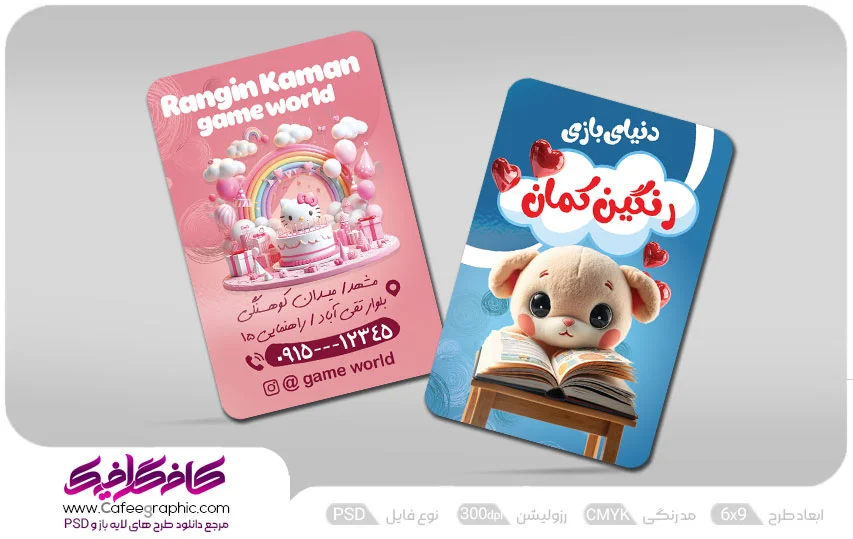 کارت ویزیت تبلیغاتی فروشگاه اسباب بازی کودک با زمینه و طراحی کودکانه و شاداب به رنگ روشن جذاب برای تغیرات و شخصی سازی کافی است فایل را دانلود نمایید و با فتوشاپ تغیرات لازم را اعمال نمایید.