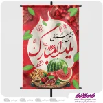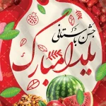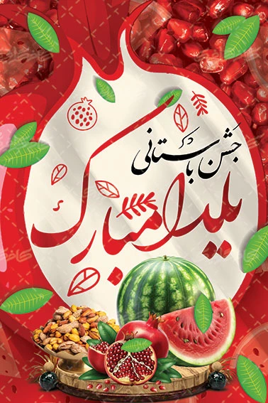 با بک گراند قرمز و به همراه عکس با کیفیت انار و هندوانه و ظرف آجیل که نماد و سمبل شب چله می باشد و تایپوگرافی جشن باستانی یلدا مبارک طراحی شده است .