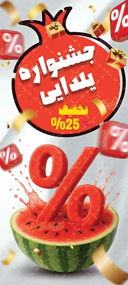 با بک گراند قرمز و به همراه عکس با کیفیت از هنوانه و درصد تخفیف فروش که نماد و سمبل فروش ویژه شب چله می باشد طراحی شده است .